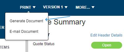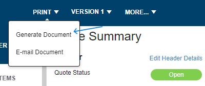 1. While in a completed quote, click the “Print” dropdown at the top right of the screen and select “Generate Document”.