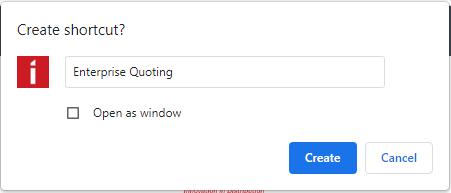 5. The “Create shortcut” window will open. Change the name from the default to Enterprise Quoting, check “Open as window” and select “Create”.