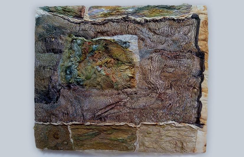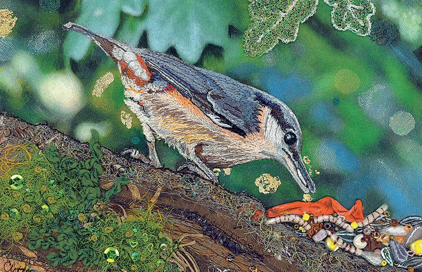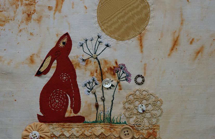 Inspired by magical urban creatures. Leonie works with raw edge applique, rust dyed fabrics and vintage haberdashery. Rust dyeing’s unpredictability adds unique marks to the fabric, reflecting urban spaces.