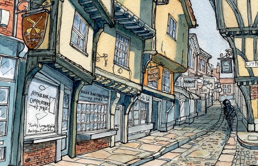 Original and vibrant paintings accentuating the playful and aged buildings of York and North Yorkshire, with a focus on colour. Oil and pen and ink work, print and cards.