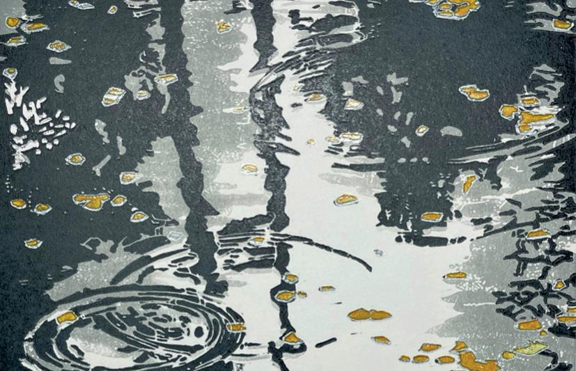 Phill creates linocut and drypoint prints. His work shows a fascination with the surface of water (ripples, reflections, floating leaves) and other natural subjects and often exhibits a subtle Japanese style.
