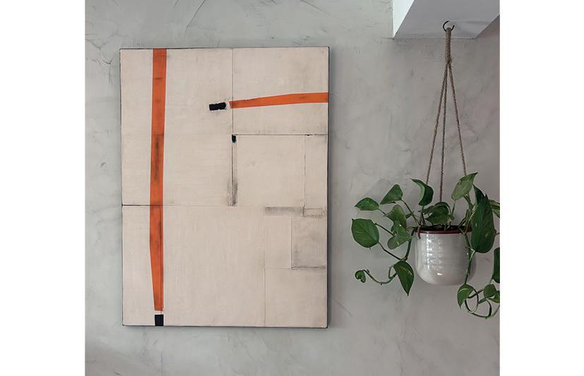 Mick works mainly with acrylic paint and chalk powder along with other media which he applies to wooden boards to achieve a layered, industrial aesthetic in his abstract paintings.