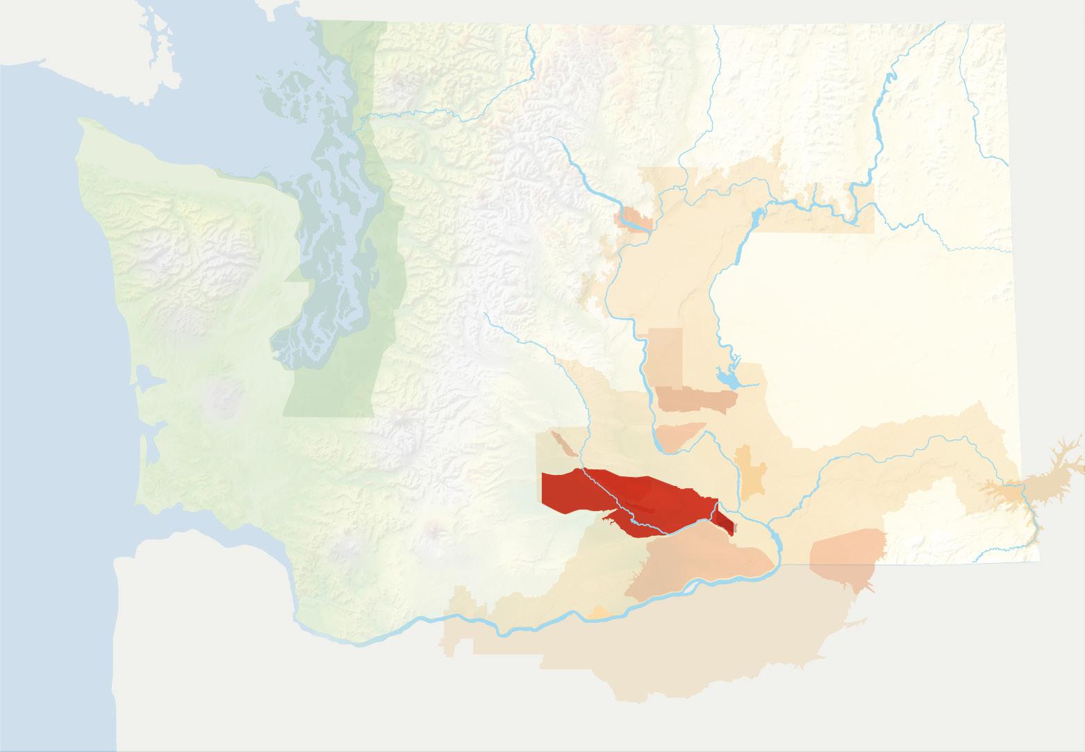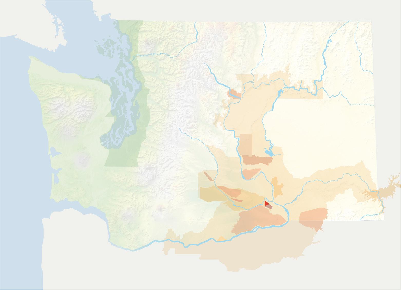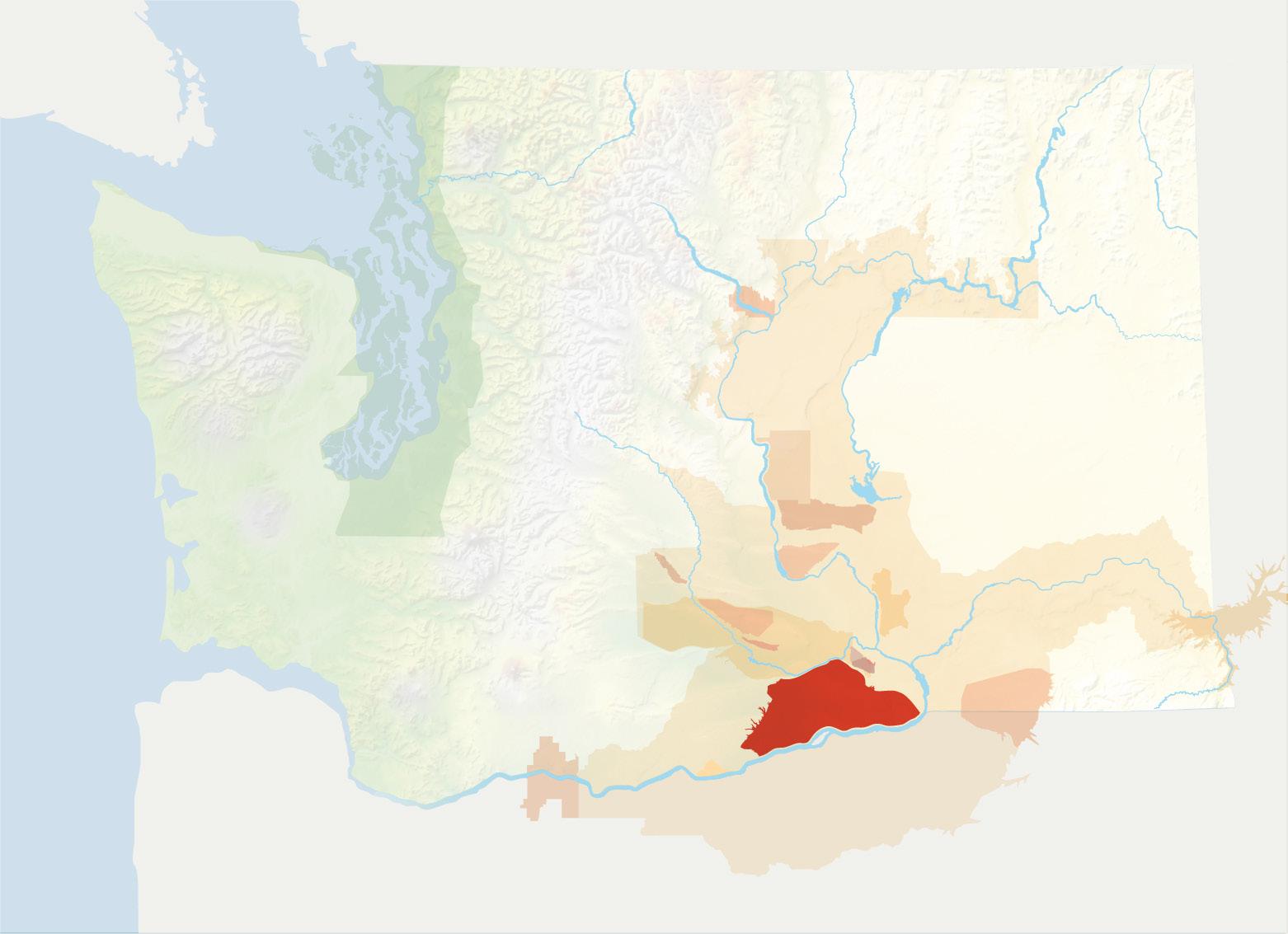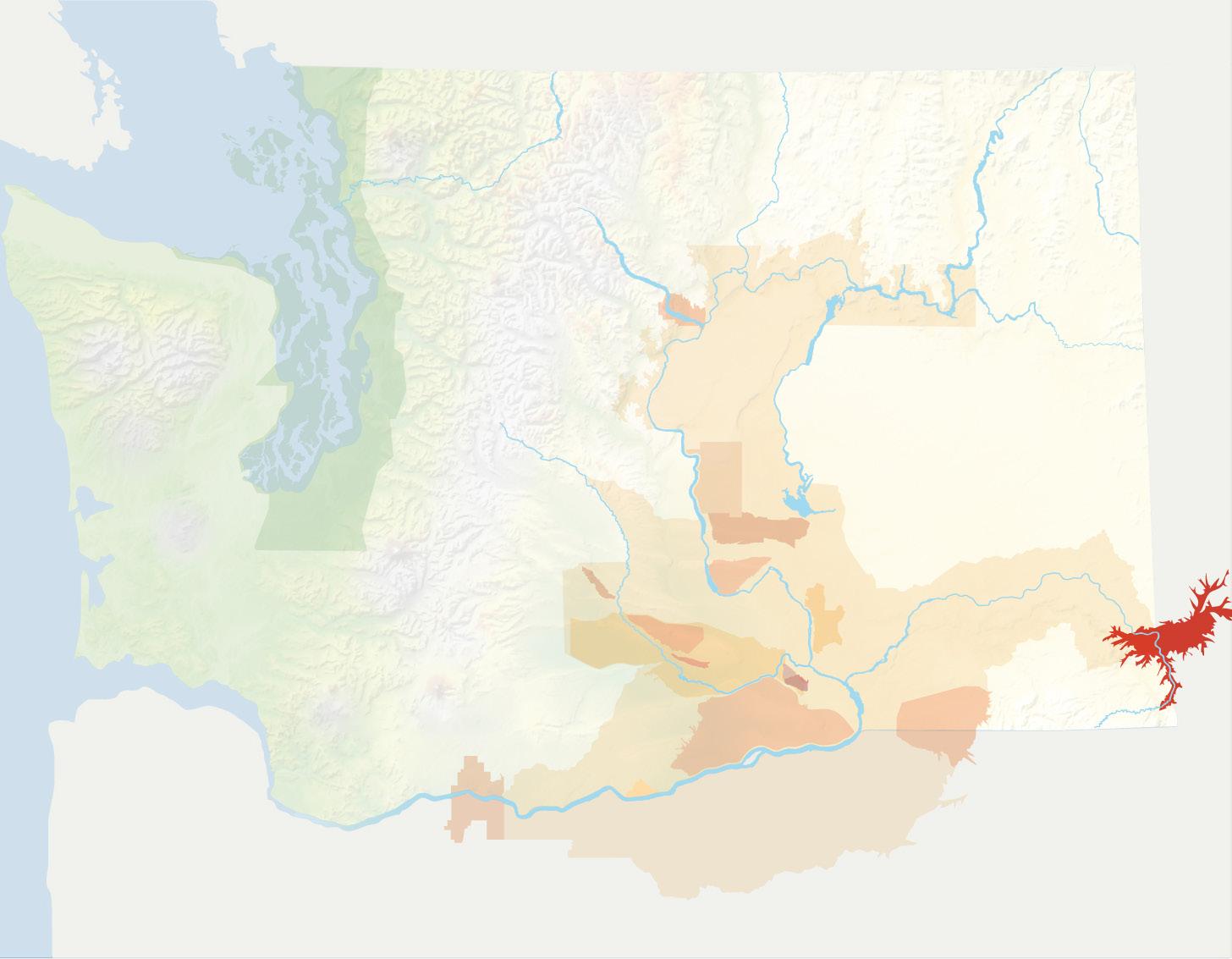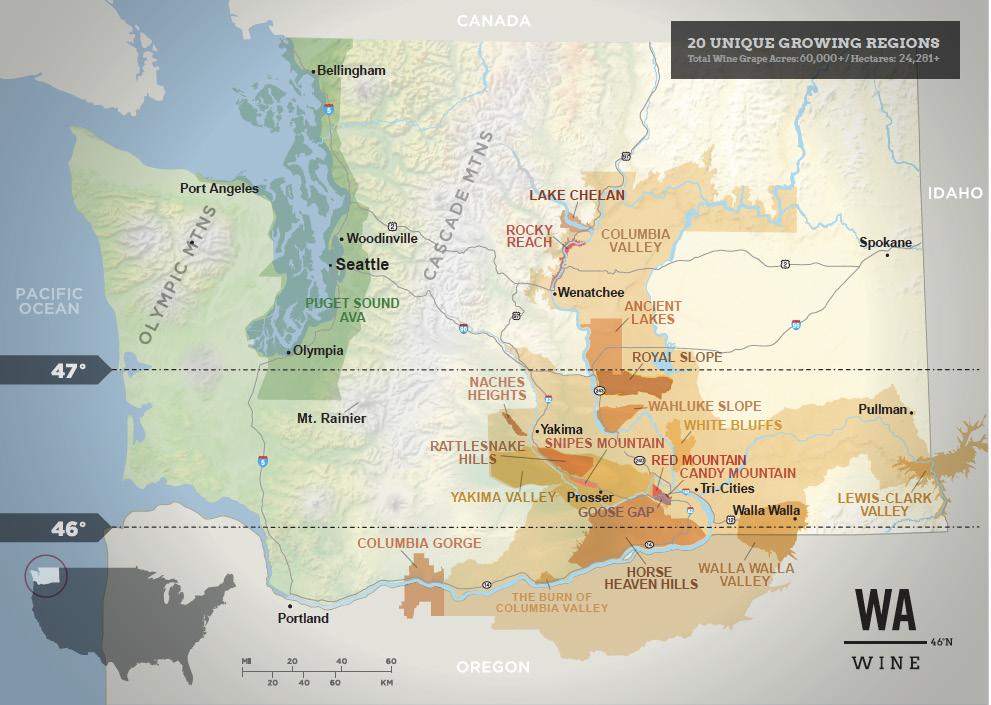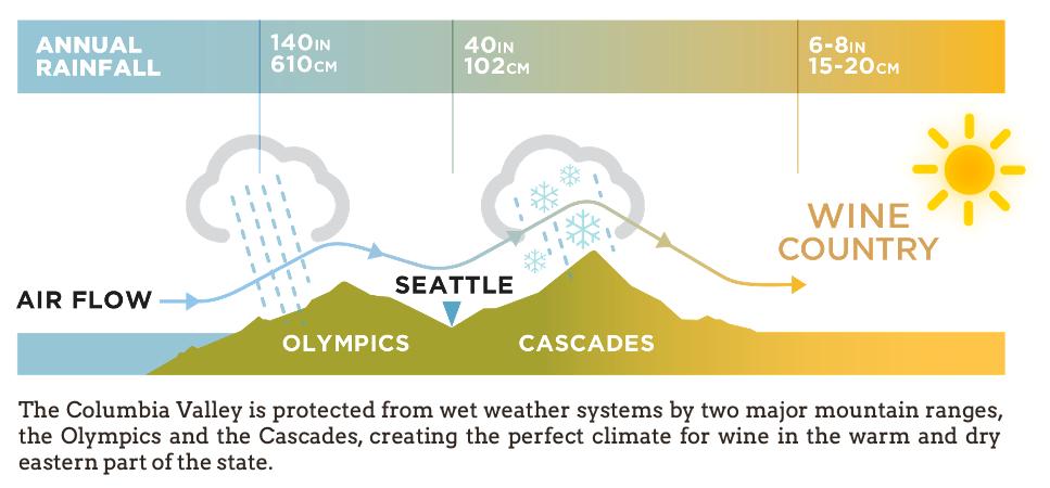 The Cascade Mountains play a key role in the levels of precipitation and temperature to the east, which is where 99% of all Washington State vitis vinifera grape vines grow. The large, light brown area on the graphic belowrepresents a vast majority of the Columbia Valley AVA and all of its sub-AVAs like Yakima Valley, Walla Walla Valley, Horse Heaven Hills and Wahluke Slope.