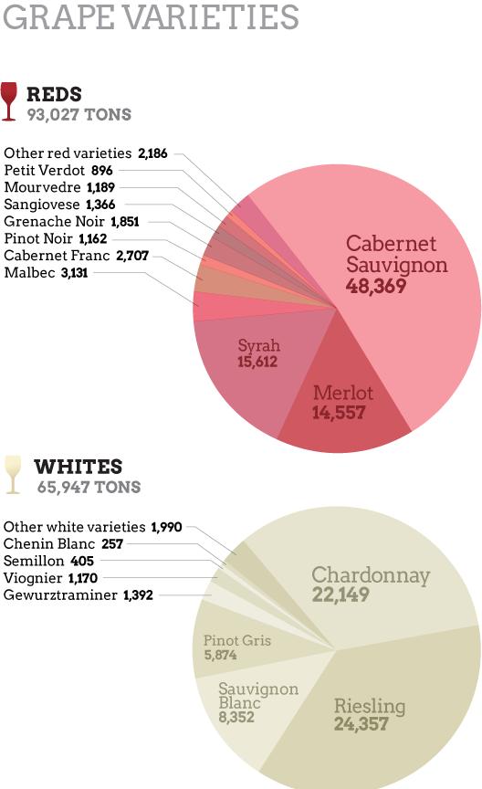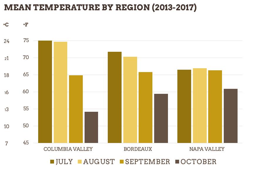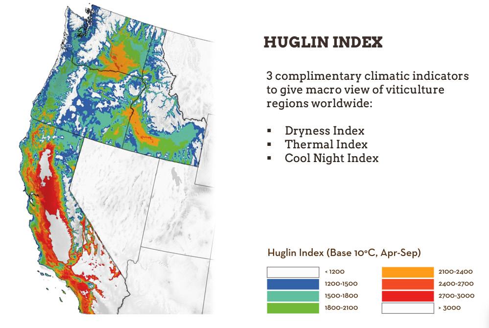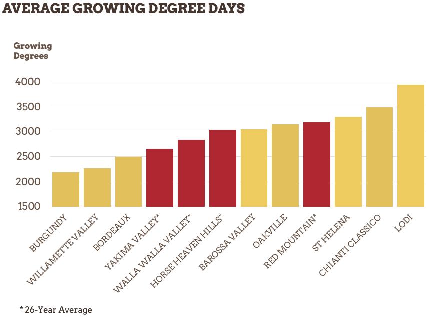 There are five climate region classifications. Climate Region I (up to 2,500 degree days) is the coolest and is similar to regions like CHAMPAGNE and CÔTE D’OR in France and the RHINE in Germany. Climate Region II (from 2,500 to 3,000 degree days) is similar to France’s BORDEAUX region. Climate Region III (from 3,000 to 3,500 degree days) is equivalent to France’s RHÔNE region. Climate Region IV (3,500 to 4,000 degree days) is similar to southern Spain. Climate Region V (more than 4,000 degree days) is the hottest region and is similar to North Africa. Other states, such as OREGON and WASHINGTON, also use this method to classify their regions.