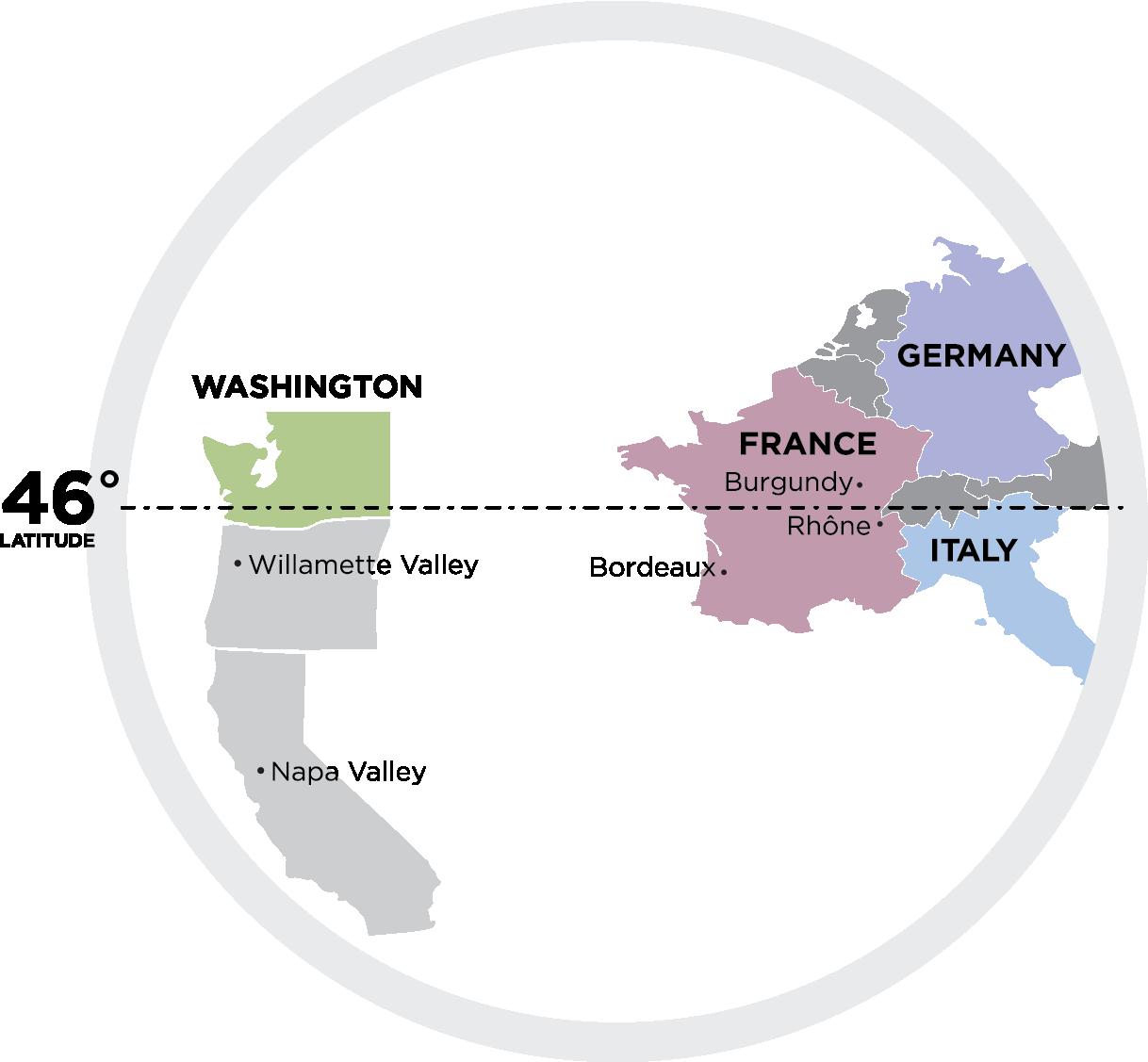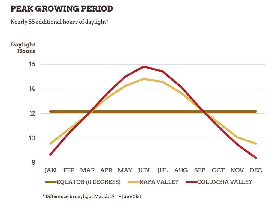 Eastern Washington is the highest-latitude wine region to experience this rain shadow phenomenon in the New World. While the growing season in Washington is slightly shorter from beginning to end than more southerly wine regions, the number of sun hours received is equal due to long days at such a high latitude — receiving up to 16 and a half hours of sun each day.