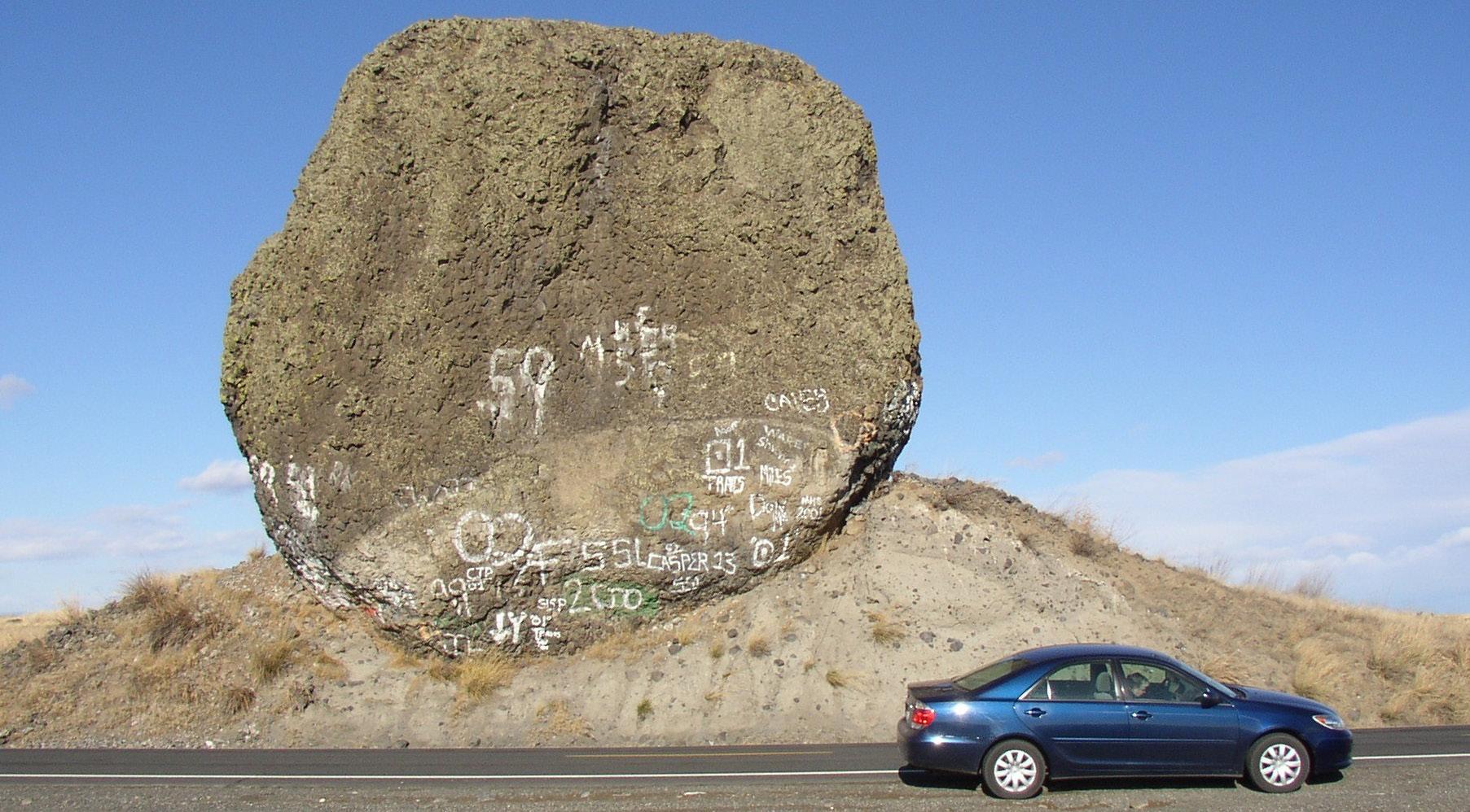 In the event that glacial ice is “rafted” by a flood such as that created when the ice dam broke during the Missoula Floods, the erratics are deposited where the ice finally releases its debris load. Amidst the vineyards in Washington State, one will find erratic from stone type originating in Canada and Idaho, ranging from small rocks all the way to boulders. This is Yeager Rock, Waterville Plateau, Washington – not a wine grape growing area, but you get the point!