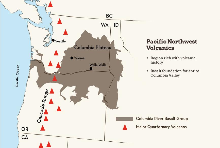 If you dig a deep enough hole in a Columbia Basin vineyard, chances are that you will eventually encounter basalt. Basalt is a dark-colored volcanic rock that was formed via the cooling and crystallization of lava that spewed out of huge fissures in eastern Washington and Oregon. These voluminous lava flows, which erupted during the Miocene Epoch around 15 million years ago, are known as the Columbia River basalt. They constitute one of the most extensive areas of basalt bedrock on any continent.