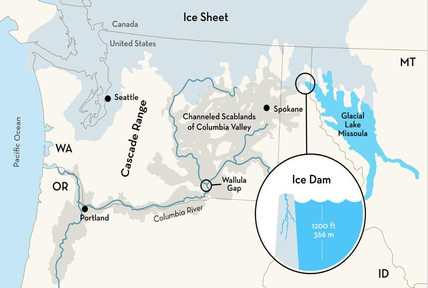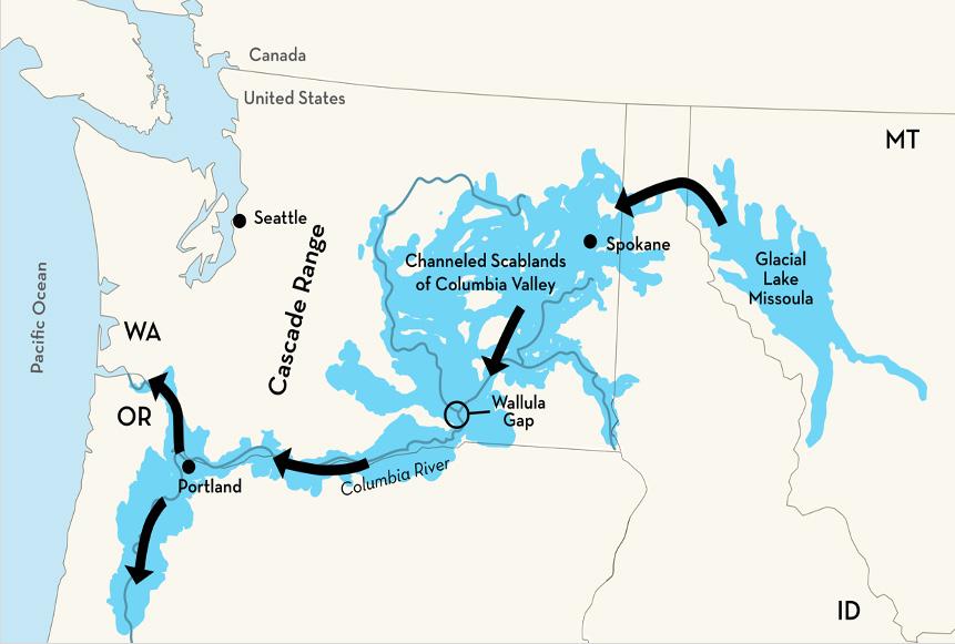 At first, Bretz did not understand where all this water could have originated. At the same time, J.T. Pardee postulated that a large lake existed in western Montana that was dammed by a lobe of the Cordilleran ice sheet in northern Idaho. Bretz finally made the connection and dubbed it the Lake Missoula or Spokane flood. The figure below shows glacial Lake Missoula in western Montana and the path of the Lake Missoula flood through the Pacific Northwest.