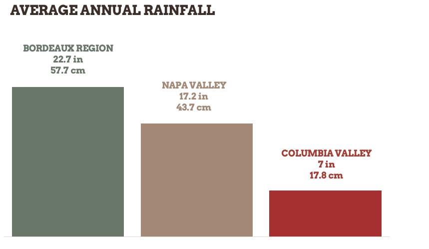 Eastern Washington’s dry growing conditions are the result of the Olympic and Cascade Mountain ranges combining to stop clouds and moisture that roll in off of the Pacific Ocean. These mountain ranges create a rain shadow in the eastern portion of the state. Overall, eastern Washington vineyards receive an average of 7 to 12 inches of rainfall annually.