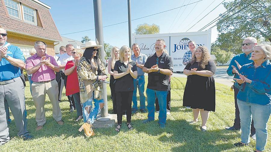 signifying her studio is officially open for business. The actual studio is upstairs at 711 E. Main St., Cherryville, a.k.a. the Johnson Building. Helping her celebrate the opening, are a host of family members and friends, as well as Cherryville city and Chamber staff and officials. (photo by MEP/The Eagle/CF Media)