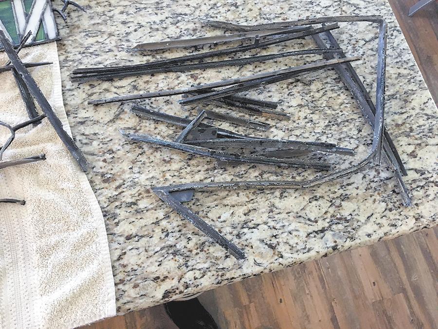 Bits and pieces of the green and white stained glass comprising the original signs.
