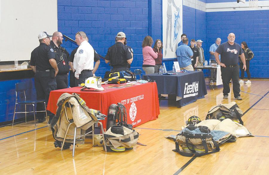 Members of the Cherryville Fire Department talked as they waited for more classes to come through the CHS gym, where all the booths were set up. (photos by MEP/The Eagle/CF Media)