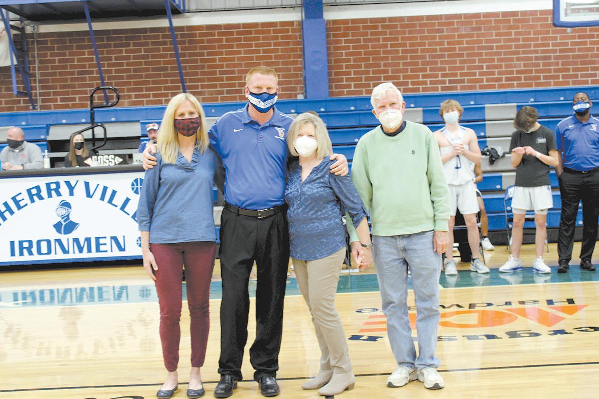 CHS Ironmen head basketball coach Scott Harrill with his family, wife, Teresa, and sons, Lane (left) and Trevor (right).
