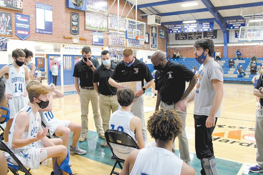 GO IRONMEN! – The head Ironman himself, Coach Scott Harrill (center, in gray suit) doing what he has done so well these past 24 years of roundball coaching – giving his troops their battle plan and marching orders so they can get out onto the Bud Black Court at Nixon Gym and give it their all for four 8-minute quarters.