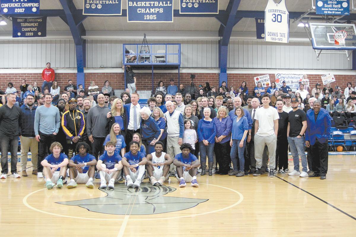 Coach Scott Harrill is surrounded last Friday night, Feb. 3, by family, friends, and current and former players in celebration of his retirement at the end of this season.