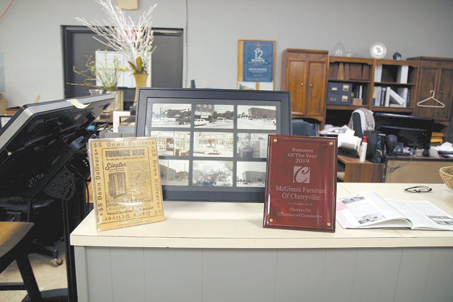 McGinnis Furniture proudly shows off an old newspaper clipping for when their store opened, alongside their 2019 Chamber Business of the Year award.