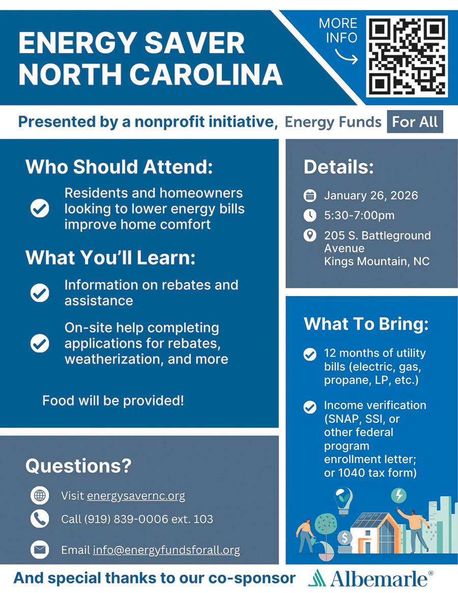 to attend January 26 from 5:30 to 7 p.m. at Trackview Hall, 205 S. Battleground Ave., Kings Mountain, located around the corner from Albemarle’s Kings Mountain Project Center.