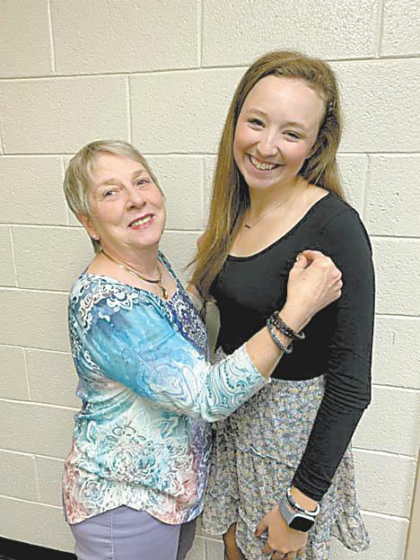 Chief Childress’ wife, Marsha, pins on his badge during his swearing-in ceremony on Friday.