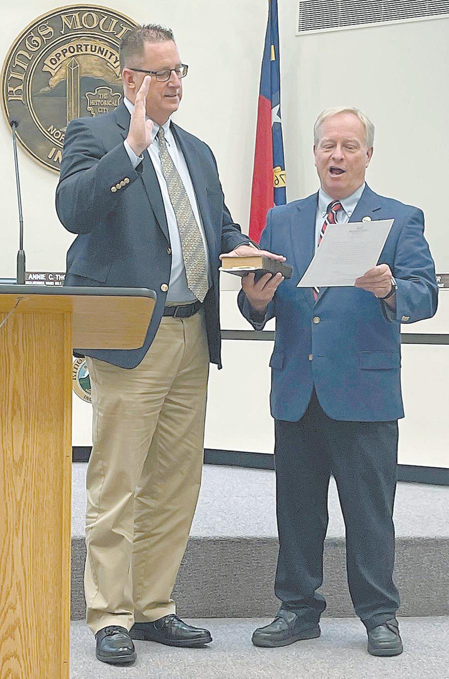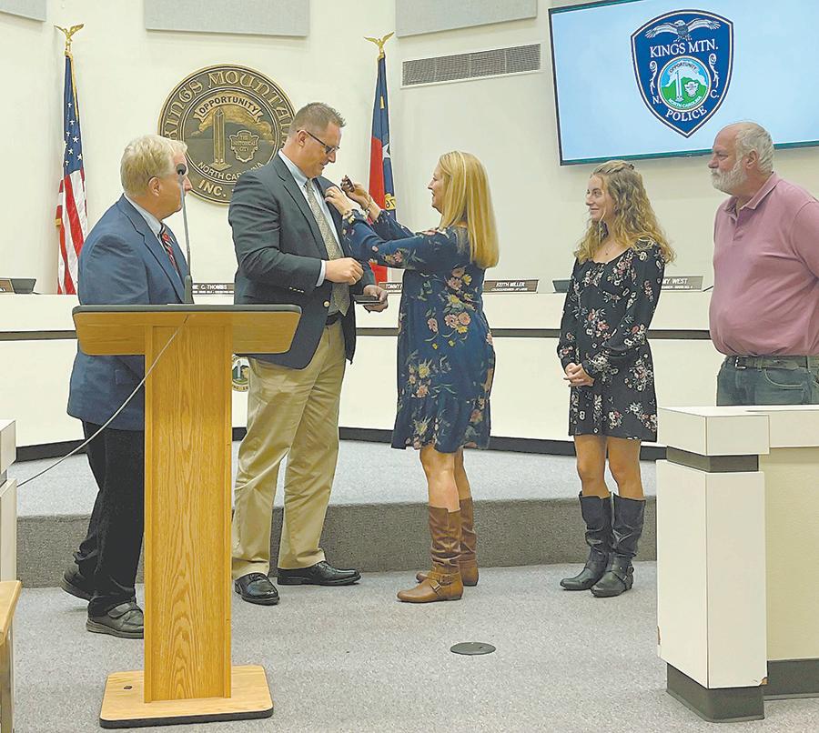 On Friday, October 14, Gerald Childress was sworn in as City of Kings Mountain’s newest Police Chief. Childress and took over KMPD on Monday, August 29. Chief Childress’ wife Marsha pinned on his badge during the ceremony as family, friends, and staff looked on.