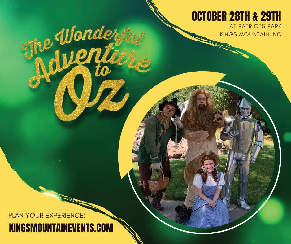 Want to meet the Scarecrow? Take a journey to Patriots Park, Friday, October 28 and Saturday, October 29 as the City of Kings Mountain turns the park into the merry ole Land of Oz. Walk down the Yellow Brick Road and visit with, the Scarecrow, Dorothy, and other favorite characters from the classic story, while trick or treating along the way. The Wonderful Adventure to Oz begins each night at 6:00 p.m.