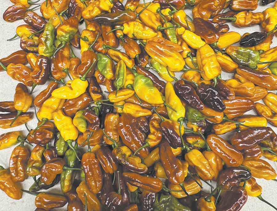 a hot pepper similar to a habanero that changes to a purple and orange shade when ready to harvest.