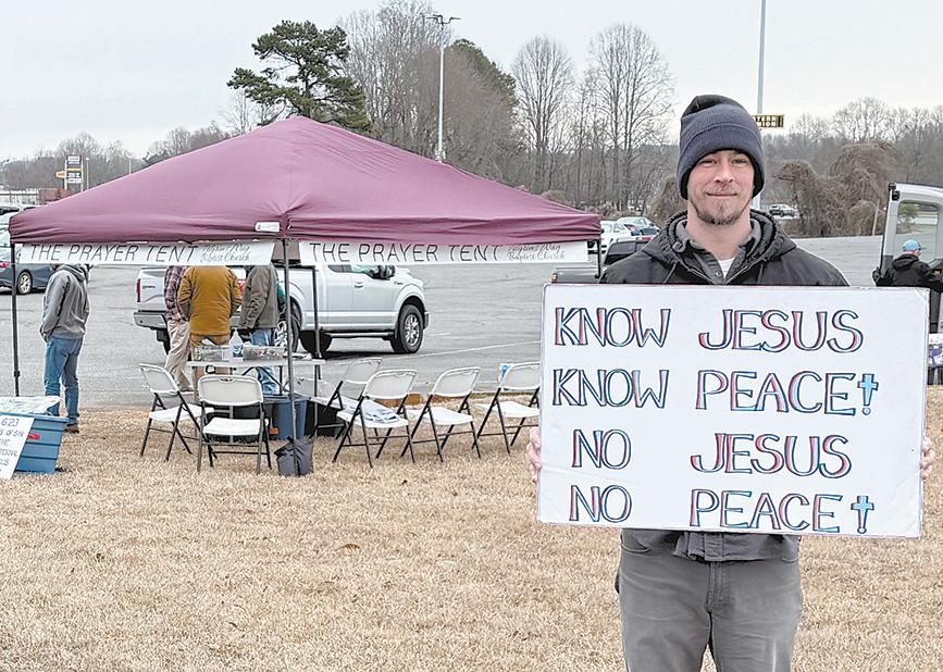 Chris Fite holds the poster that so many Christians agree with. Following the Lord’s orders to care for the poor, Pilgrim’s Pathway Ministries, which will benefit from the offering at Stronger Together at R.S. Central on January 25, offered a prayer tent and distribution of socks, winter clothes, household items and other free stuff, Wednesday, January 14 in the parking lot at the Dollar General in Spindale. Pilgrim’s Pathway is a halfway house for men leaving prison. Pastor Wayne Stafford, who runs the ministry, says prisoners come from all over the Southeast because it is one of the few serving men getting out of prison. The ministry joined forces with the Pilgrim’s Path Baptist Church to distribute the aid and pray for folks who asked for prayer.
