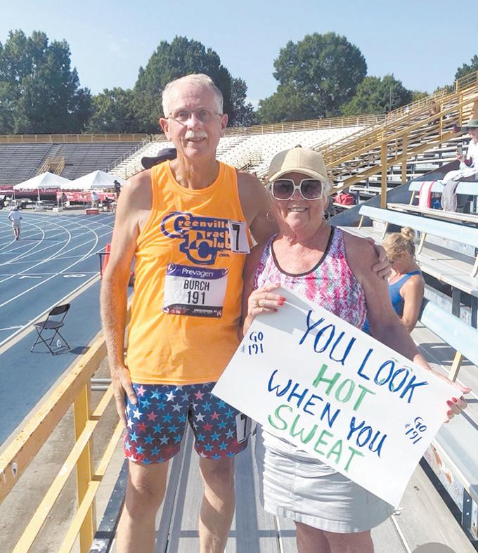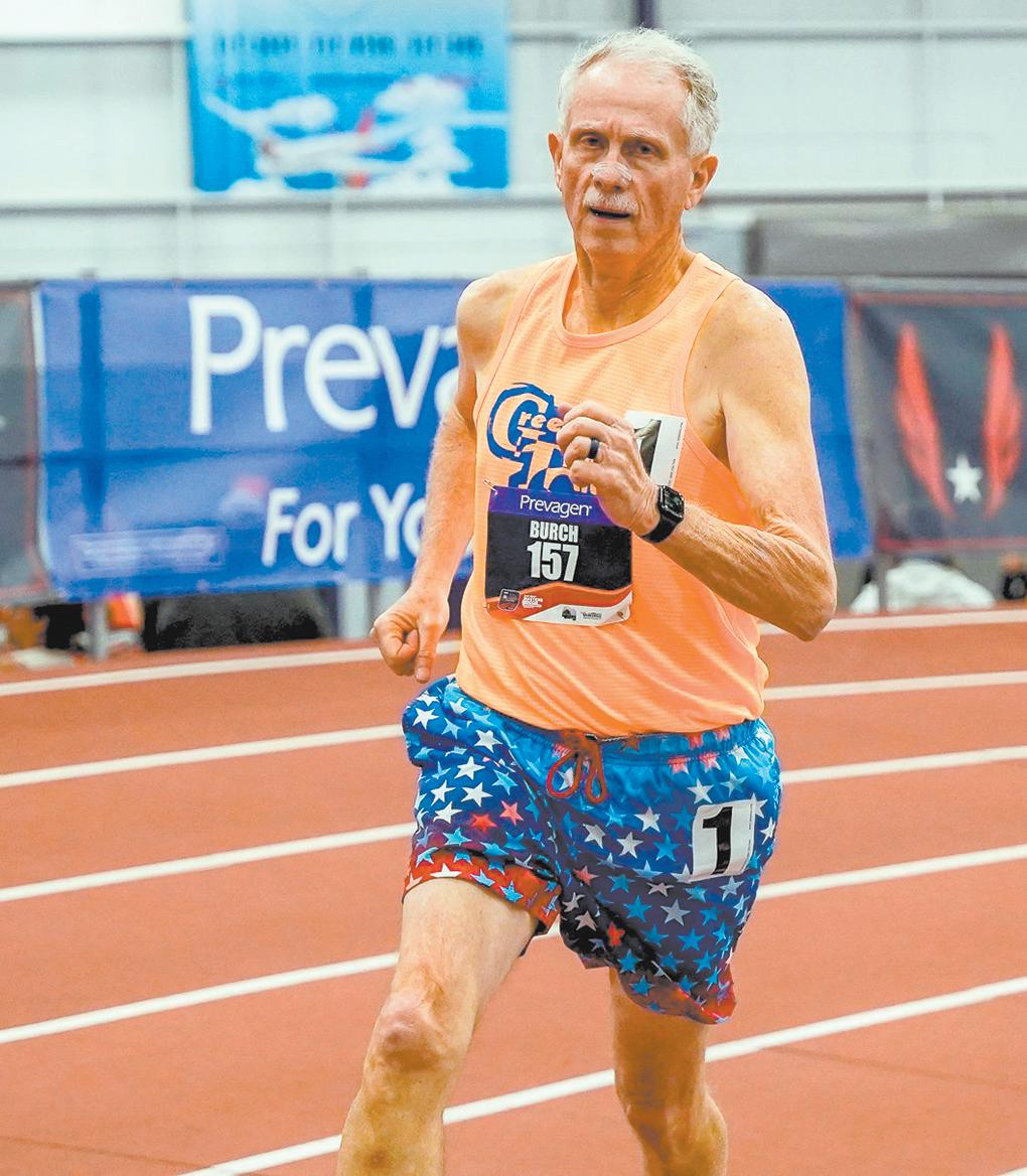 The National Senior Games are held every other year and USATF Nationals are annual. Without the benefit of a coach and only using internet training plans, Bob began winning regional track meets in NC and SC. In 2024 he won gold at the NC Senior Games State Finals in Durham, setting new NC state records in both the 800m and 1500m. With those wins, he qualified for the 2025 National Senior Games in Des Moines, Iowa where he won national titles in both the 800m and 1500m races. Also, in July 2025 he won gold in the 400m and silver in the 800m at the USATF Masters Outdoor National Championships in Huntsville, Alabama. Burch is a member of the Greenville Track Club.