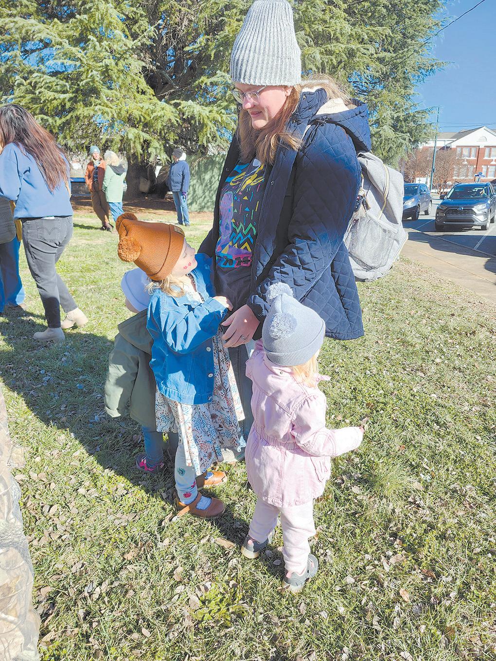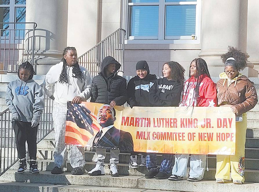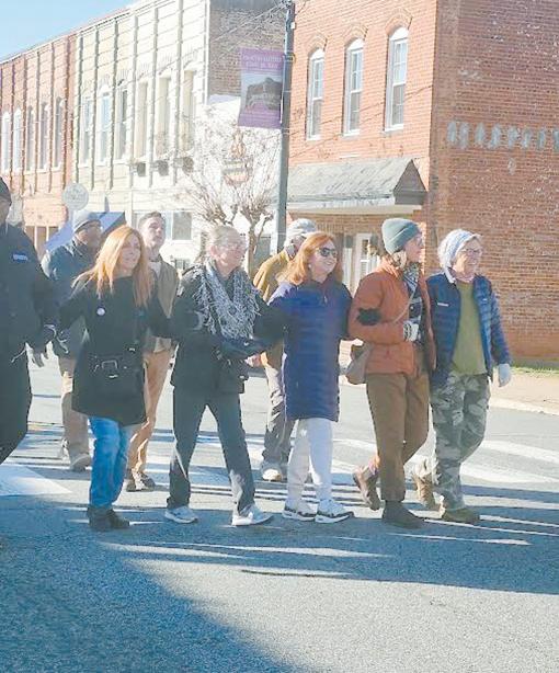 People came together on a cold Monday morning, Jan. 19 to honor the memory and legacy of Dr. Martin Luther King Jr. Most participants gathered at the Rutherfordton Town Hall and led by MLK Committee of New Hope members carrying a banner, marched north on Main Street to the courthouse lawn for a brief ceremony. Some locked arms for the walk through town and Overcome.”