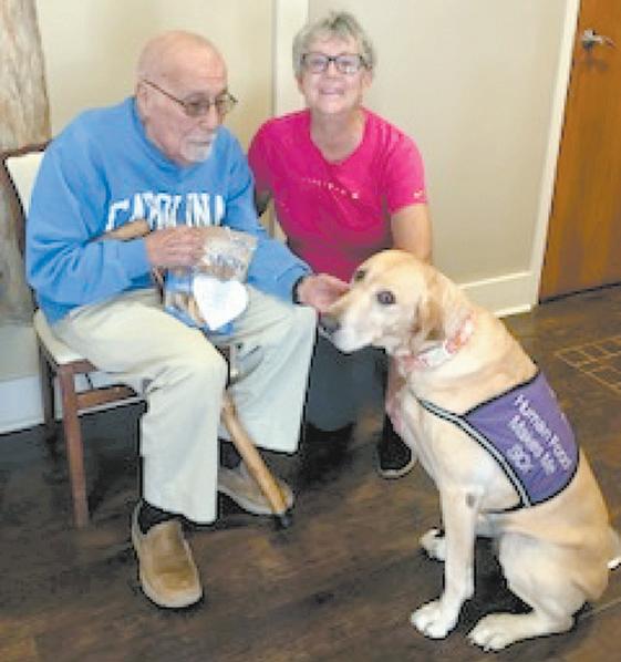 Linda Bailey from Foothills Pilot Club and Co-Pilot, Mike DeLorenzo, visit Scout, Forest City Hospice House Facility Dog, to give her a “pick me up” to thank her for being a caregiver. Scout is eight years old. Her birthday is April 16. She has been at Hospice House almost three years. She can be seen going from room to room to be with someone. Foothills Pilot Club recognizes caregivers in various ways throughout the year.