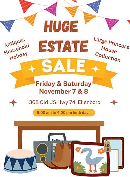 HUGE ESTATE SALE. Friday, November 7 and Saturday, November 8; 8AM-4PM. Antiques, household, holiday, large Princess House collection. 1368 Old US Hwy. 74, Ellenboro, NC 28040