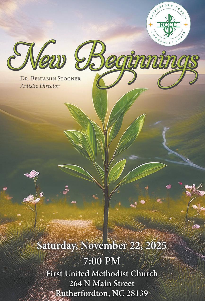 The newly organized Rutherford County Community Choir is presenting its inaugural music program, New Beginnings, on November 22 at 7pm at the First United Methodist Church, Rutherfordton.