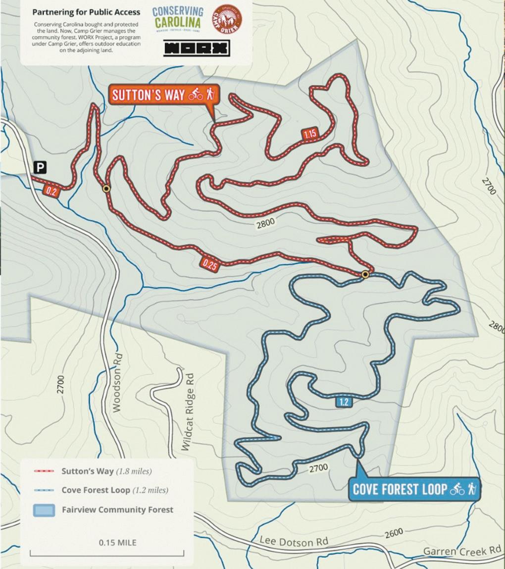 The forest is located on Woodson Road in Fairview, NC. There is not a street number, but if you search for “Fairview Community Forest” in Google Maps, you can find directions.