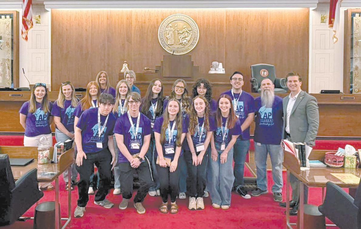 Shown are the students and leaders- front row (left to right): Andrew Sutton, Colby Seigla, Layla Lancaster, Gracelyn Lail, Ava Garland. Second row- Meredith Street, Allison Tate, Kaylee Ash, Abigail Thompson, Adriana Tartaglia, Savannah Hodge, Sarah Webber, Dawson Loving, Superintendent Dr. David Sutton, Representative Jake Johnson. Third row- Karen Davis, Gail Wilkins.