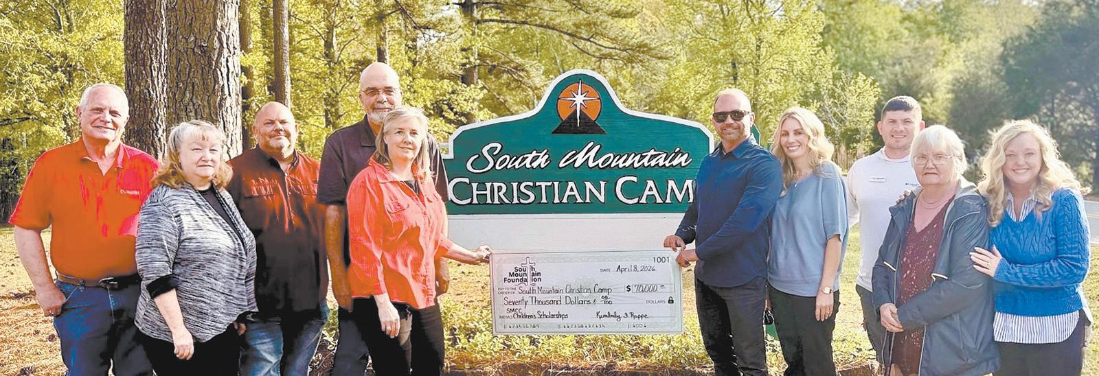 Supporters and friends of the Foundation for South Mountain Christian camp are shown here presenting a $70,000 dollar check in support of scholarships for the campers whose famillies can’t afford to pay. South Mountain has served campers for many years regardless of ability to pay. Shown here are: Dale Ramsey, Grant Deviney, John Ruppe, Cheryl Whiteside, Kim Ruppe, Jay Oliver, Carrie Oliver, Justin Baldwin, Charlotte Fish, Jennifer Stevens.