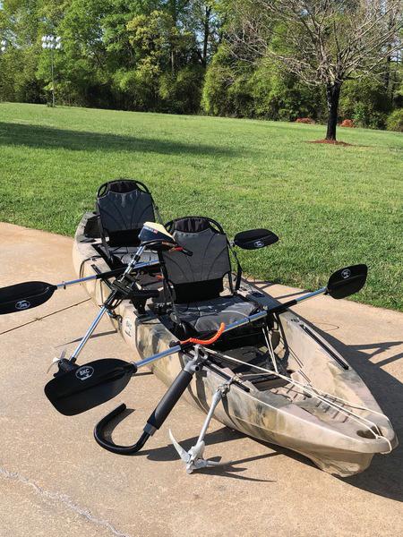 KAYAK FOR SALE Brooklyn Kayak Co. 12.9’ Tandem Fishing Kayak w/upright aluminum frame with backrest support seats, paddles, rod holder, and anchor. Also included: Minn Kota 35 trolling motor and 2 life jackets. Like new! $700. (704) 472-0554