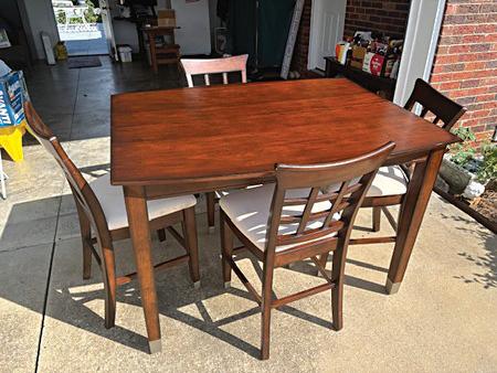 TABLE WITH CHAIR. Hight top table w/ 4 chairs, all solid wood. Comes w/ 2 12” inserts. Call for measurements if needed. $65.00 (704) 692-4765 wilcurb@aol.com