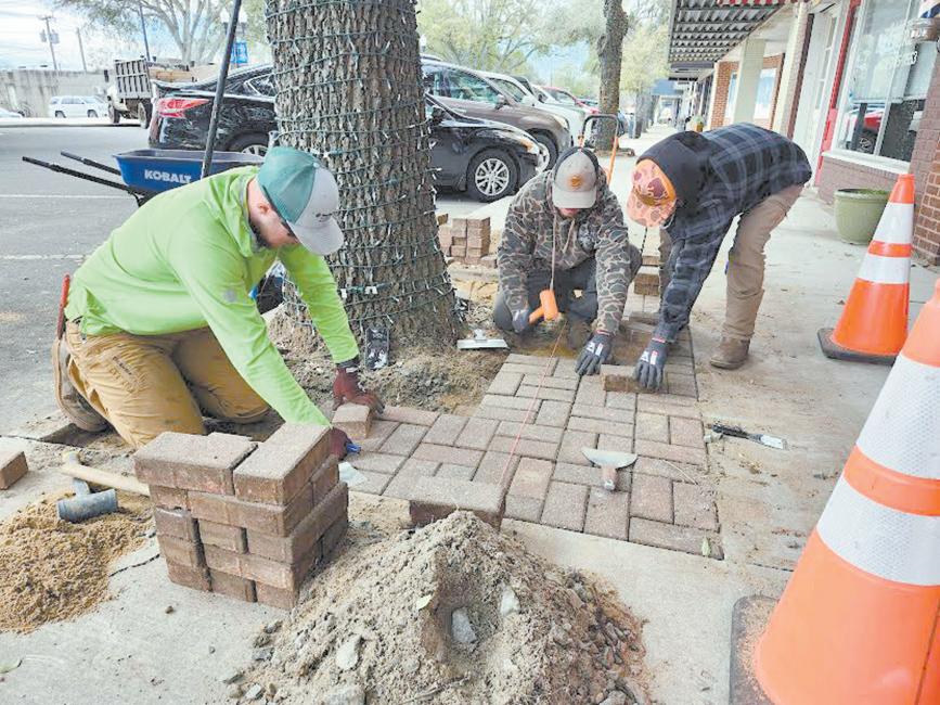 Michael Wheat (front, left) along with Devin Brooks and Seth Lowery from Sunny Side Lawn Care are working to make walking along Main Street in Forest City safer. They are replacing old bricks with new ones to level the areas around trees.