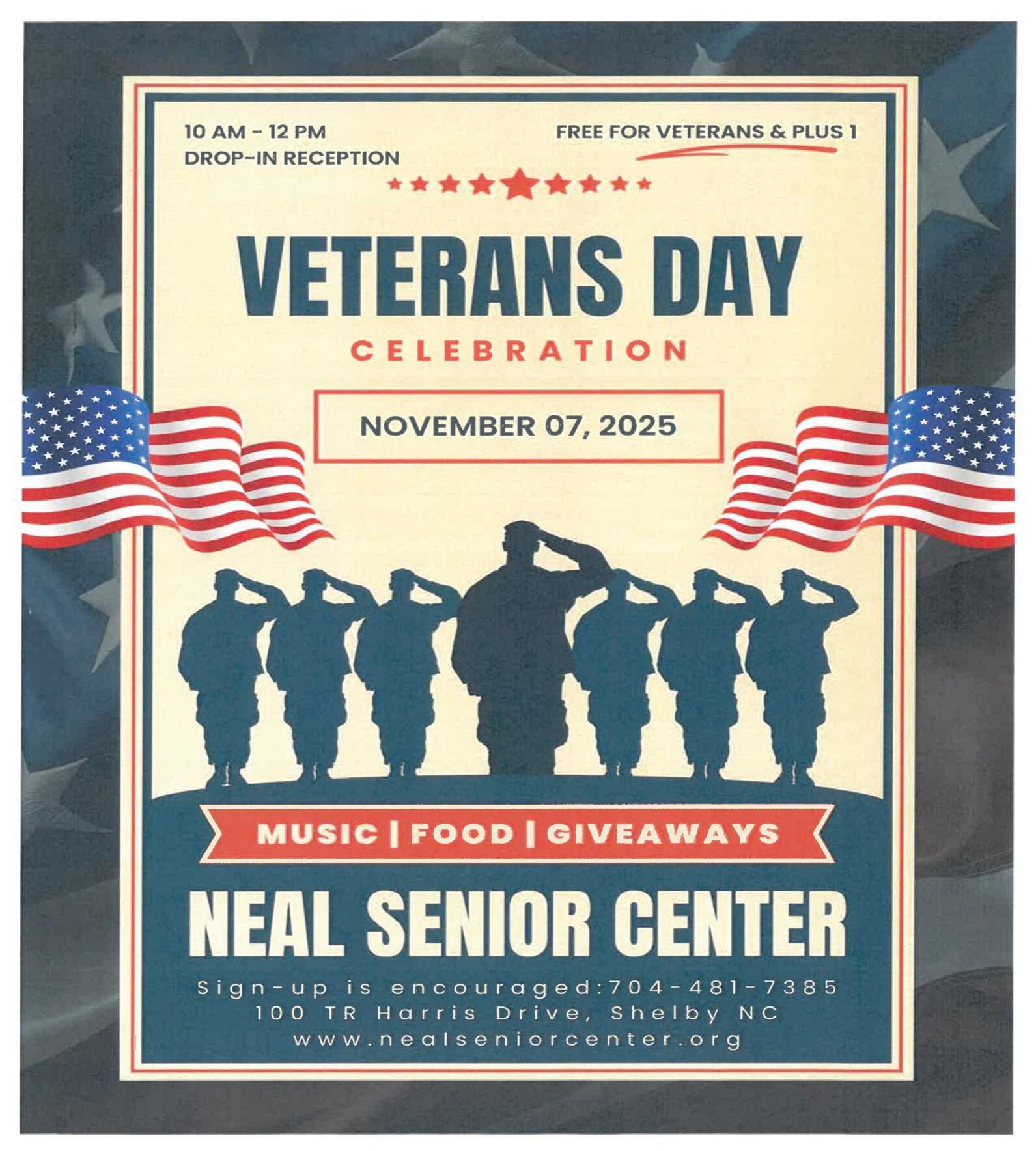 More Info: Parade begins at 10am. Program begins at 11am. Parade begins at S. Lafayette & Graham Streets. Program will be held on the south lawn of the Earl Scruggs Center. Parade registration is open until November 4, 2025. Registration forms may be picked up at the Veterans Service Office, Cleveland County Administration Bldg, 311 E Marion St, Monday-Friday from 8am to 5pm. Also, by emailing tvmustang68@bellsouth to receive a form or call 704-435-1516 if you have questions.
