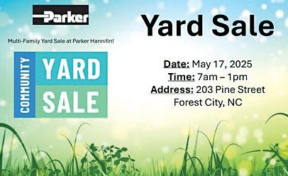 YARD SALE. at Parker Hannifin in Forest City on Saturday, May 17, 2025 from 7:00AM1:00PM! 203 Pine Street, Forest City, NC 28043