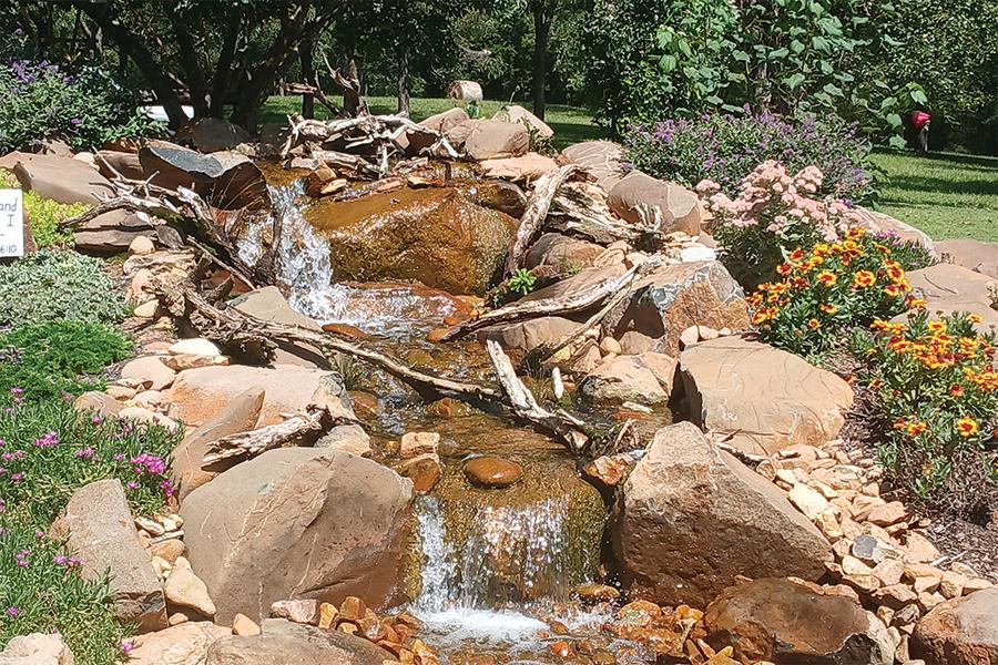 The setting at Stony Point Farm was picturesque and peaceful, featuring beautiful flowers, trees, a rock fountain, and a historic log cabin.