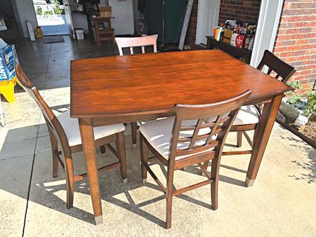 TABLE WITH CHAIRS. High top table w/ 4 chairs, all solid wood. Comes with two 12” drop-in inserts. Call for measurements if needed. $65.00 (704) 692-4765 wilcurb@aol. com