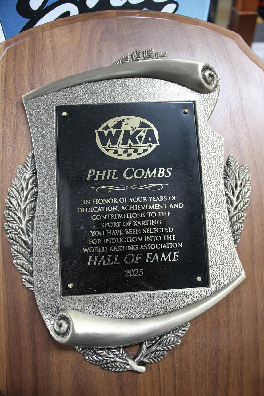 The plaque that Combs was awarded at his World Karting Association Hall of Fame induction.
