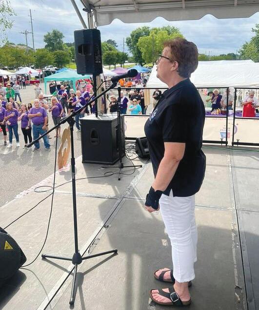Ms. Cindi Welch, co-event lead for a past year’s Relay For Life, held at Shelby’s Dover YMCA, addresses the volunteers and participants during the event.