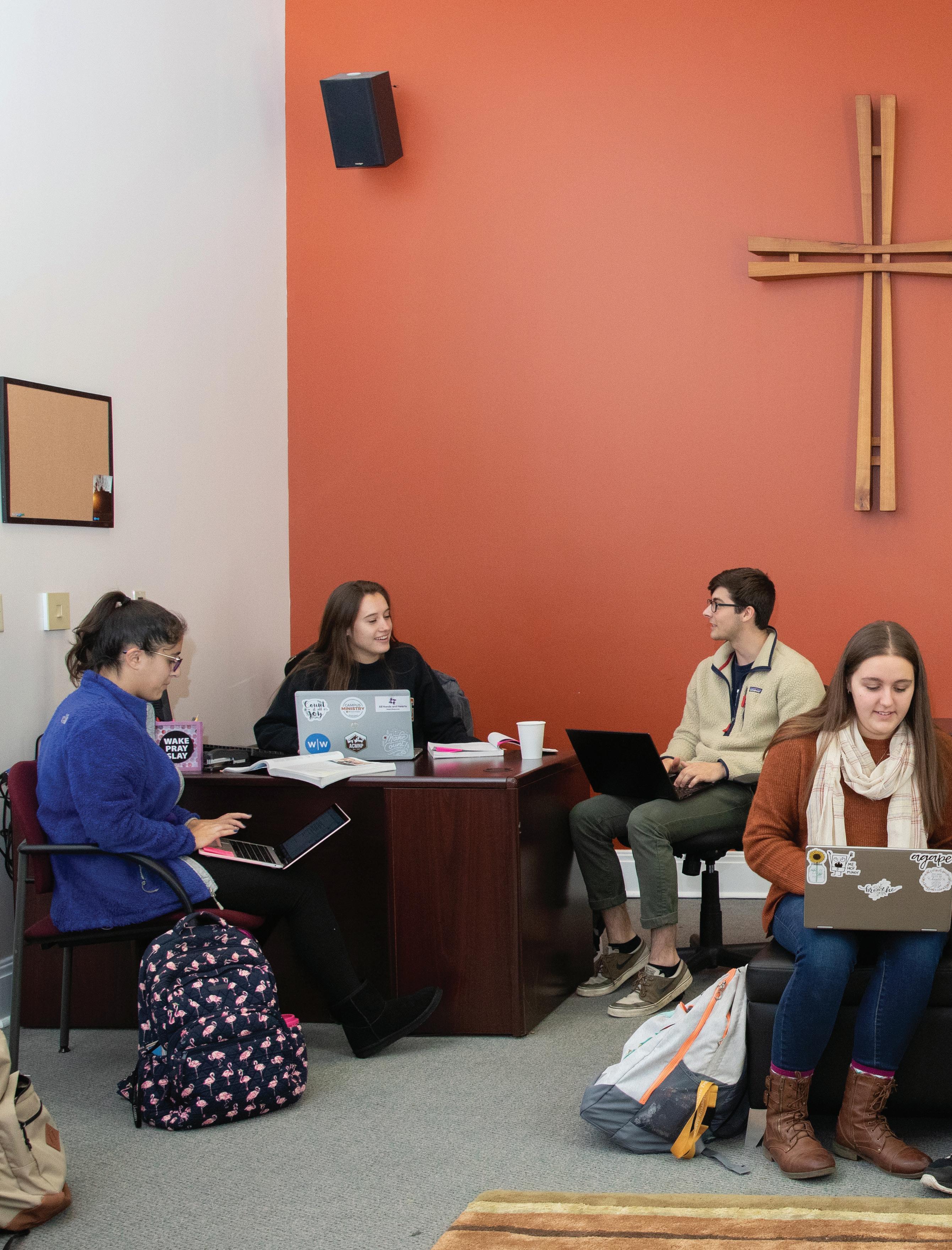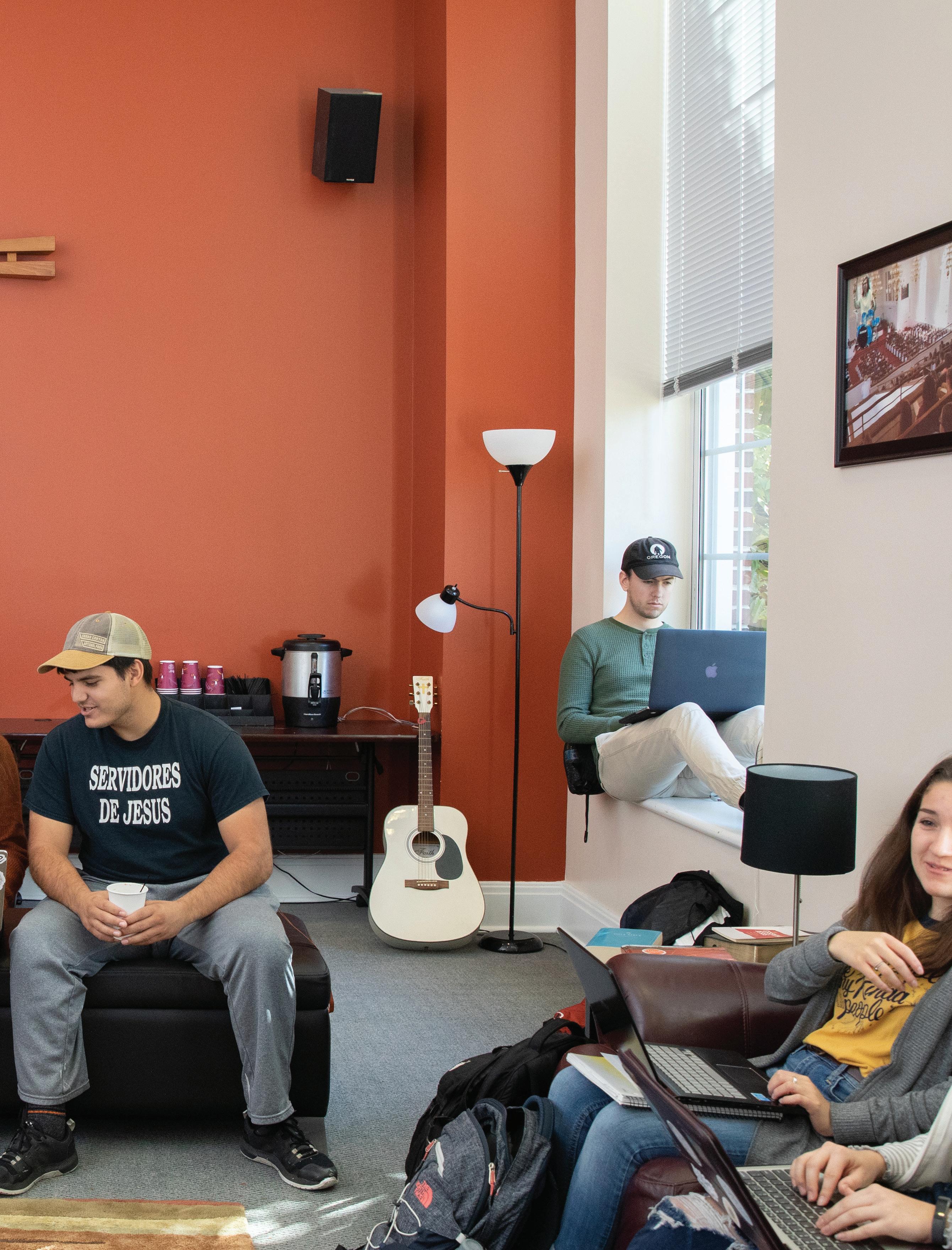 Students connect in “The Hub,” the main space for the Center for Campus Ministry.