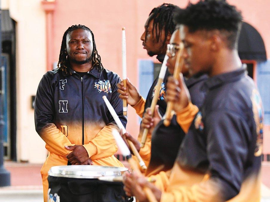 Reginald Gooding leads members of the Funk Nation Drumline during a 2024 practice session along Center Street in downtown Goldsboro.
