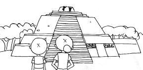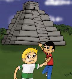 Brandon no quiere bajarse del autobús, pero su m a m á i n s i s t e . E n E k ’ B a l a m h ay u n a p i r á m i d e grande. La familia sube a la pirámide. A Brandon no le gusta. Él está cansado y tiene dolor de cabeza.
