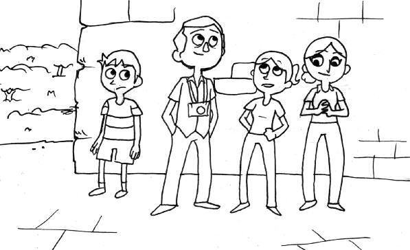 A las 7:00 de la mañana, el autobús llega y la fam i l i a s e s u b e . B ra n d o n e s t á m u y c a n s a d o y s e duerme en el autobús. A las 9:00, el autobús llega a unas ruinas mayas. Las ruinas se llaman Ek’ Balam.