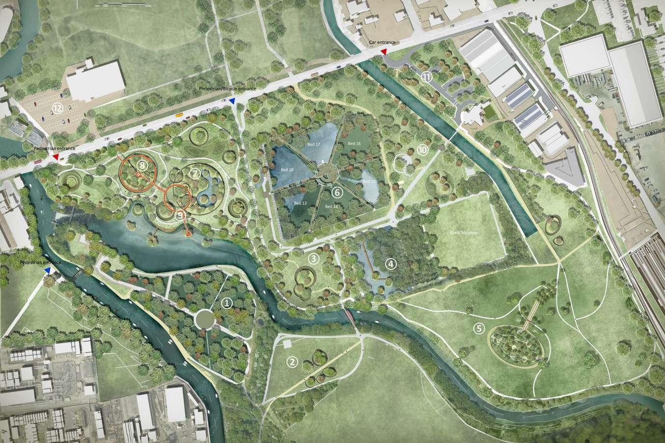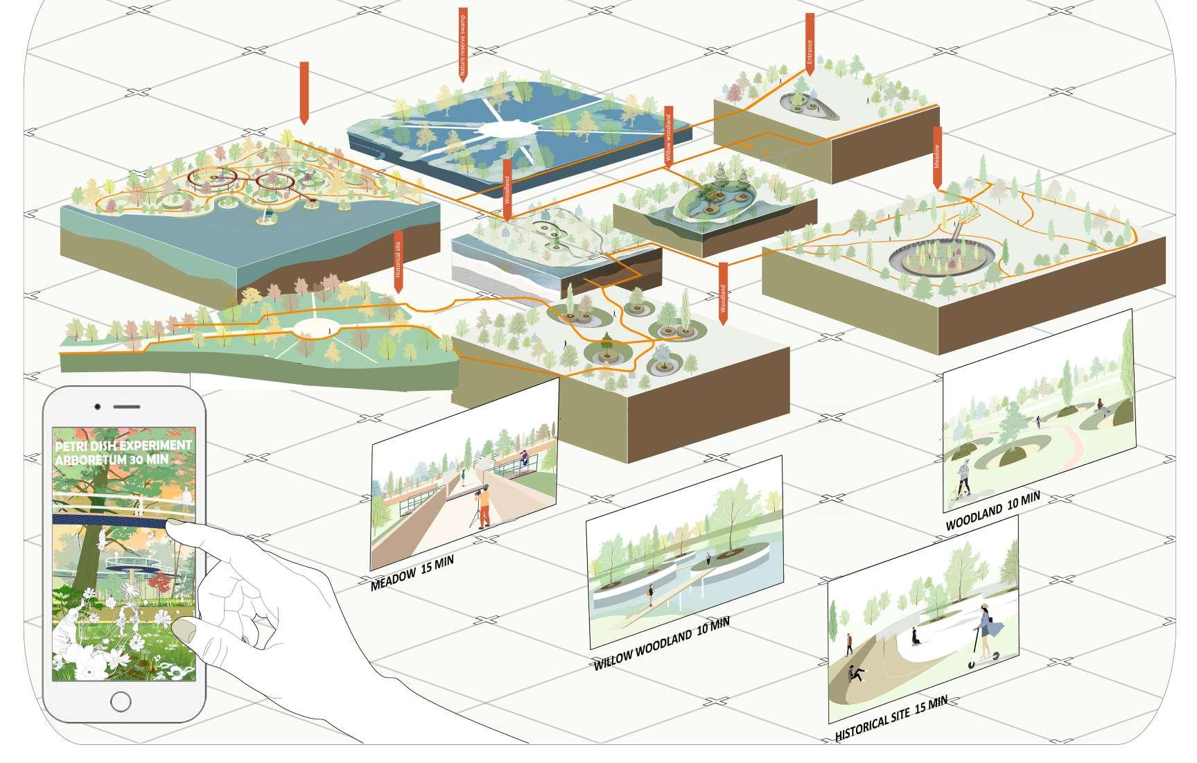 The site is a renovation of the Middlesex Filter Bed waterfront, with a number of floating islands created along the shoreline to break up the rigid shoreline and make boat trips more experiential, and ecological barges to increase the habitat for flora and fauna. The suspended walkway overlooks the entire shoreline from the forest, bridging the closed environment of the forest and the open water environment.