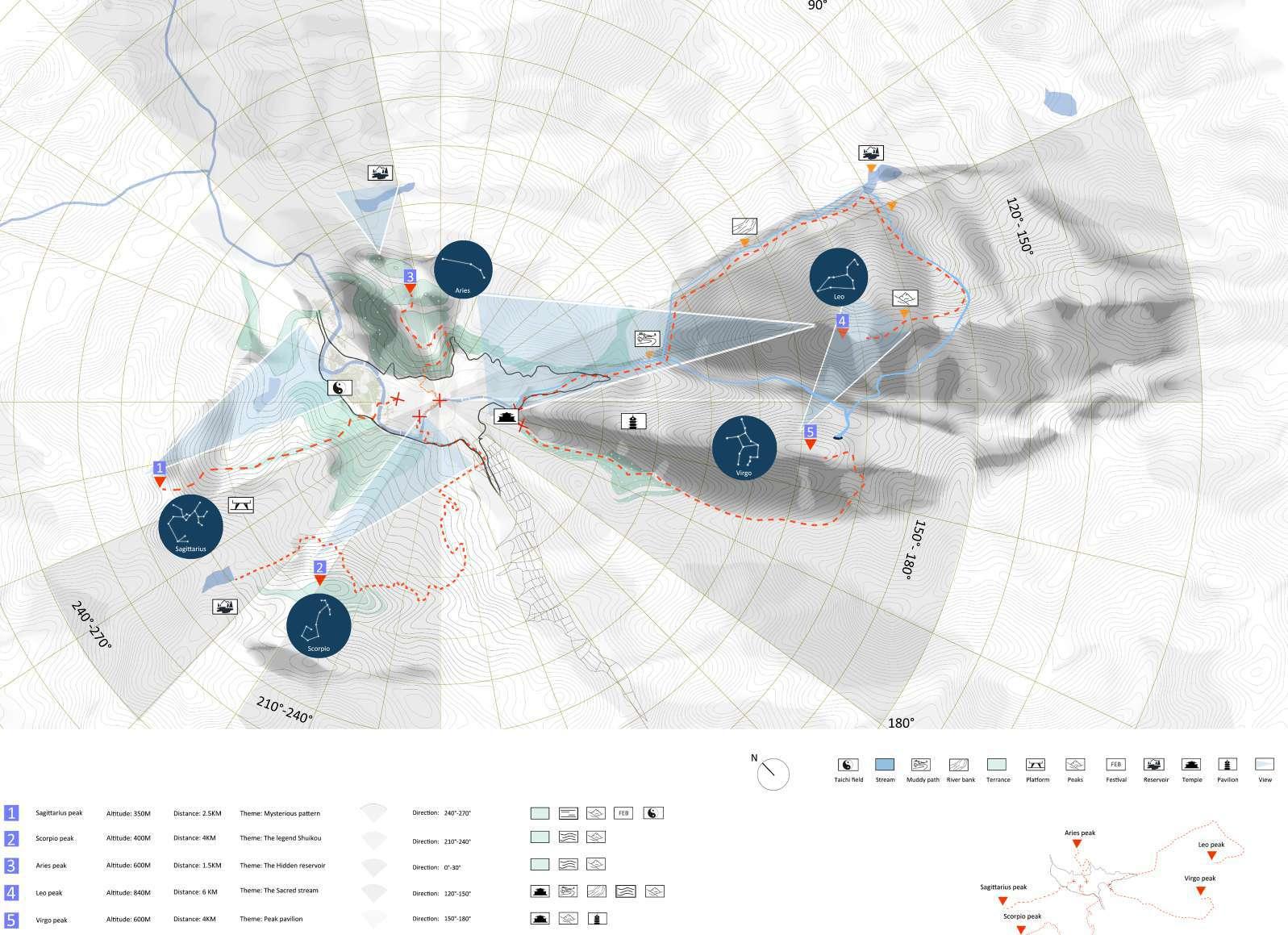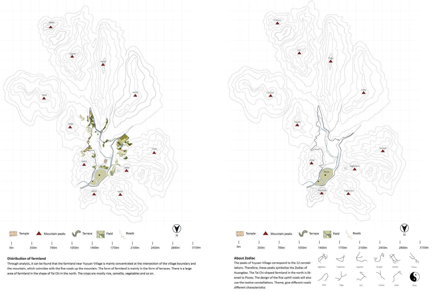 The bakc part of this project will focus on five mountains surround the Yuyuan village. Yuyuan Village was developed in ancient times by relying on good natural geographical conditions, but the village has lost its vitality in modern society,young peopel leave, aged people left So my purpose is to bring people back to discover the characteristics of this village. Looking at ancient books, the layout of Yuyuan Village is set up in imitation of the zodiac. The surrounding mountains are matched with 12 constellations. started with this feature and combined the legends of the ancient village. designed five ways uphills Each road has its own characteristics. Minimize the impact on the natural environment while designing