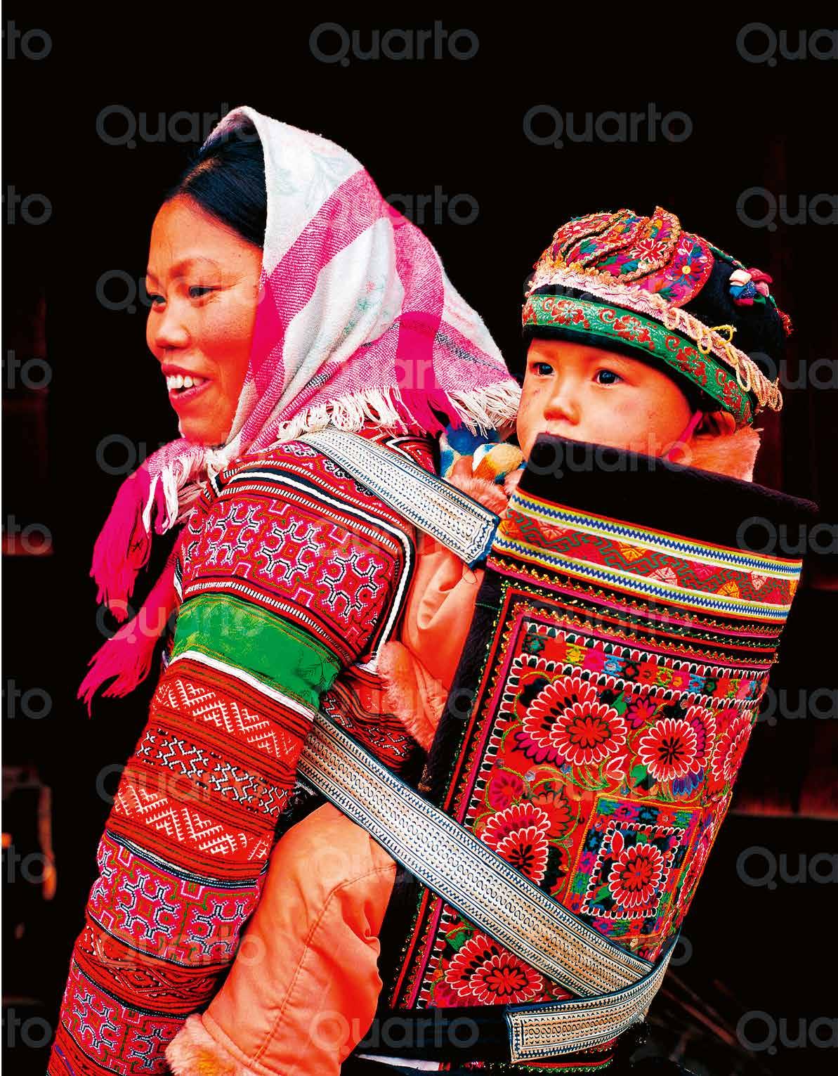 Een moeder in jasje met geborduurde mouwen draagt een jong kind in een uitgebreid geborduurde draagzak.
